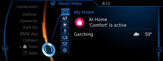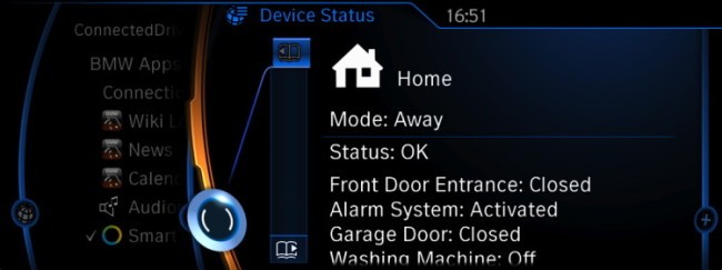 เทคโนโลยีแอพพลิเคชั่นนี้ ผู้ขับขี่หรือผู้โดยสารสามารถสั่งการระบบไฟฟ้าภายในบ้านผ่านทางจออินโฟเทนเมนต์ภายในรถยนต์ บีเอ็มดับเบิลยู อาทิเช่นการควบคุมเปิด-ปิดไฟฟ้าภายในบ้าน, การควบคุมเปิด-ปิดประตูโรงจอดรถหรือประตูหน้าบ้าน รวมไปจนถึงการควบคุมระบบปรับอากาศให้มีอุณหภูมิที่เหมาะสม, ควบคุมเครื่องซักผ้า และระบบแจ้งเตือนภัยภายในบ้าน เพื่อให้ผู้ขับขี่วางใจในสภาพความเรียบร้อยหลังจากที่ออกจากบ้านและเตรียมพร้อมก่อนเข้าบ้านอีกด้วย