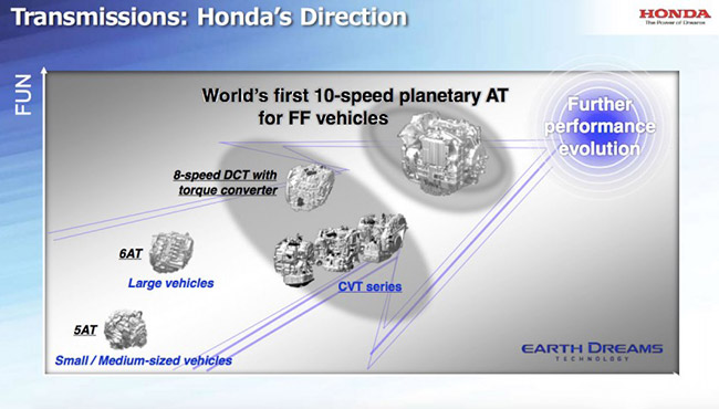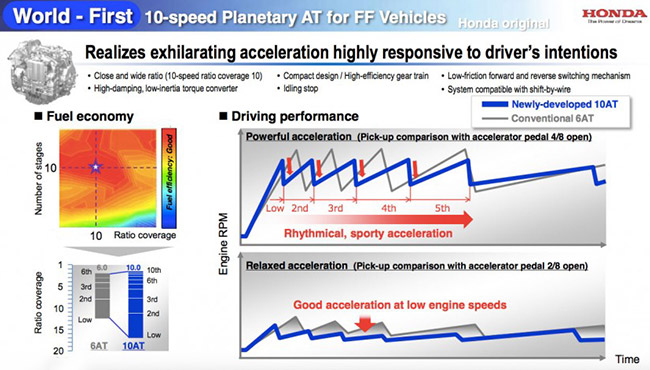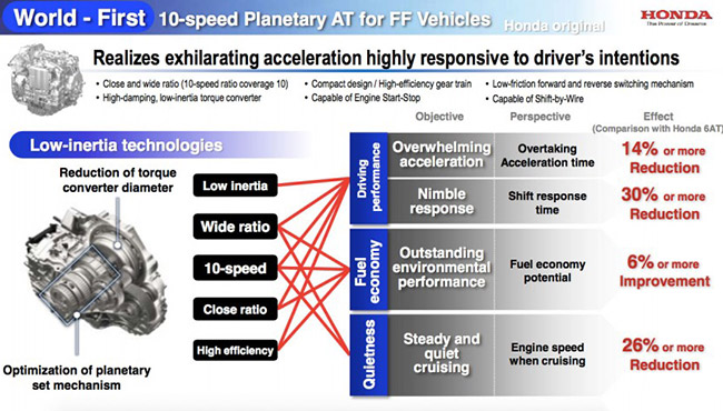 ทีมผู้พัฒนาค่าย Honda ได้ทำการคิดค้นให้ระบบเกียร์อัตโนมัติแบบ 10 สปีดนี้ มีขนาดเล็ก ไม่ต่างกับเกียร์ 6 สปีด และมีคุณสมบัติรองรับการใช้งานได้กับรถหลายรุ่น ที่จะถูกผลิตออกมาในอนาคต นอกจากนี้ ระบบเกียร์อัตโนมัติแบบ 10 สปีดยังมีความสามารถพิเศษ ปรับเปลี่ยนเกียร์ได้เร็วขึ้น 30% ให้อัตราเร่งที่เร็วขึ้น 14% พร้อมประหยัดน้ำมันเพิ่มขึ้นอีก 6%
