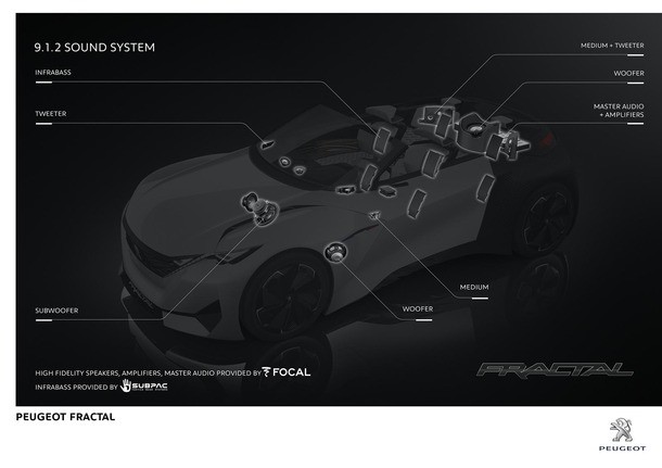 ไฮไลท์ของการตกแต่งภายในคือการใช้ชิ้นส่วนที่มาจากเทคโนโลยีปรินท์สามมิติ และเป็นวิวัฒนาการจากแนวคิด i-Cockpit มากถึง 80% ภายในแถมมาพร้อมหน้าจอเฮดอัพ ดิสเพลย์ หน้าจอแบบโฮโลกราฟฟิกความละเอียดสูง และแถบโพลีคาร์บอเนต 45 องศาที่บอกข้อมูลเพิ่มเติม ในส่วนของคอนโซลมีทัชสกรีน AMOLED ขนาด 7.7 นิ้ว ที่พร้อมรองรับระบบอินโฟเทนเมนท์ ถึงแม้ว่าเจ้า แฟรกทัล จะเป็นเพียงแค่รถต้นแบบ แต่เปอโยต์ ได้เปิดเผยว่า รถรุ่นนี้จะเป็นการกำหนดแนวทางการผลิตรถคูเป้เปิดประทุนในอนาคตอย่างแน่นอน