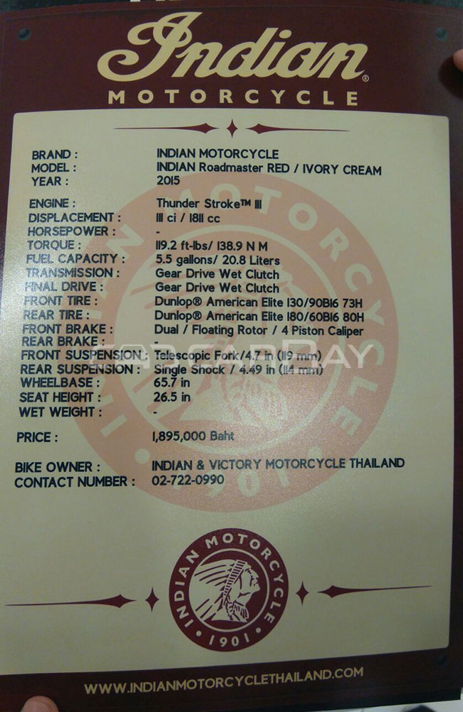 Indian Roadmaster เป็นหนึ่งในรถที่เป็นตำนานที่สุดในกลุ่มรถของ Indian ด้วยขนาดมหึมา Roadmaster มีความยาว 2656 มม., กว้าง 1000 มม. และสูง 1491 มม. ด้วยมิติที่ใหญ่โตขนาดนี้ทำให้ Roadmaster มีรูปลักษณ์ที่สะดุดตา ในขณะที่ระยะช่วงล้ออยู่ที่ 1668 มม. เพื่อเพิ่มความเสถียรขณะทำความเร็ว ขุมกำลังของ Roadmaster เป็นเครื่องยนต์ขนาด 1811 ซีซี Thunder Stroke ซึ่งสามารถสร้างแรงบิดสูงสุดได้มากถคง 138.9 นิวตัวเมตร ด้วยความจริงที่ว่ารถคันนี่มีน้ำหนักมากถึง 421 กก.ทำให้มันเป็นรถที่ค่อนข้างเฉื่อย แม้ว่าจุดประสงค์หลักของมันคือเป็นรถสำหรับการเดินทางระยะไกลที่สะดวกสบาย Indian Roadmaster มีราคาเริ่มต้นที่ 1,895,000 บาทและมันเป็นรถขนาดยักษ์ที่อาจเป็นคู่แข่งของ Harley Davidson CVO ได้อย่างสบาย