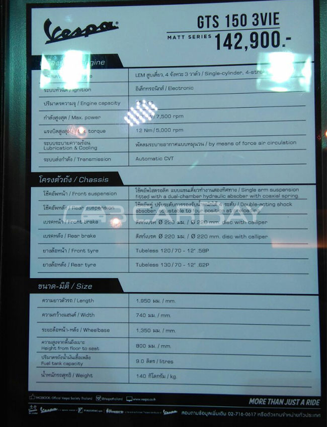 Vespa GTS 150 สี matte black มีราคาอยู่ที่ 142,900 บาทในขณะที่สี Cherry Red มีราคา 139,900 บาท